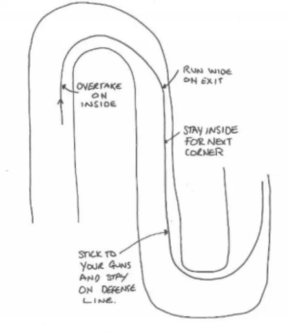 - Take the inside in the first corner, exit wide, and defend the inside for the next turn.